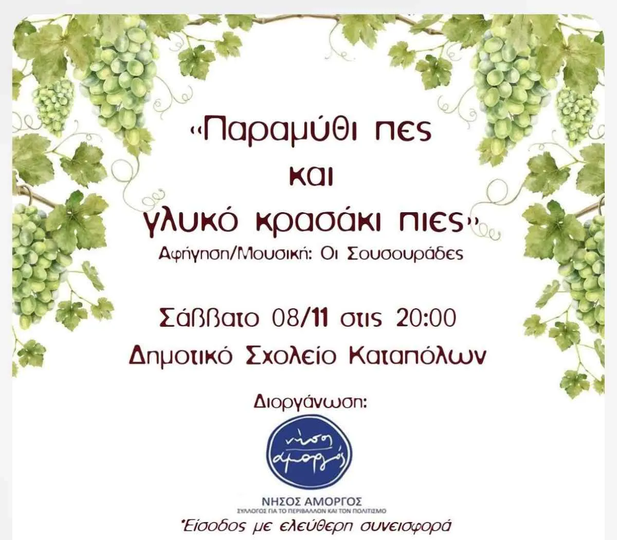 Η νέα μουσικοαφηγηματική παράσταση των Σουσουράδων αυτό το Σάββατο 8 Νοεμβρίου στις 20:00 στο Δημοτικό σχολείο Καταπόλων με τίτλο «Παραμύθι πες και γλυκό κρασάκι πιες».