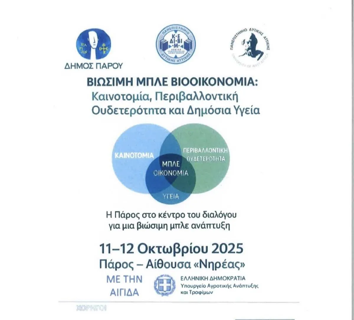 Η Πάρος φιλοξενεί στις 11 και 12 Οκτωβρίου 2025 μια σημαντική διημερίδα αφιερωμένη στη Βιώσιμη Μπλε Οικονομία, με έμφαση στην καινοτομία, την περιβαλλοντική ουδετερότητα και τη δημόσια υγεία. Η εκδήλωση, που τελεί υπό την αιγίδα του Δήμου Πάρου, της Περιφέρειας Νοτίου Αιγαίου και του Υπουργείου Ναυτιλίας και Νησιωτικής Πολιτικής, φέρνει σε διάλογο την επιστημονική κοινότητα, τους φορείς της ναυτιλίας, της ενέργειας, του τουρισμού, της βιοτεχνολογίας και της εκπαίδευσης.