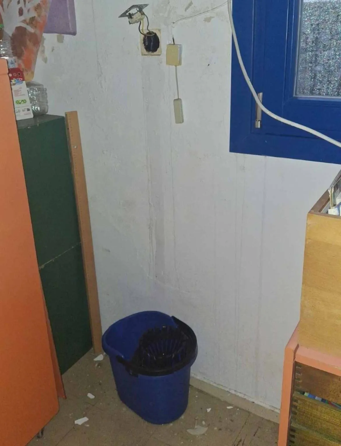 Νερά τρέχουν μέσα από τις πρίζες και πλημυρίζουν το πάτωμα, νερά της βροχής τρέχουν πάνω στα ράφια που οι εκπαιδευτικοί έχουν αποθέσει το εκπαιδευτικό υλικό και γεμίζουν το πάτωμα της αίθουσας.