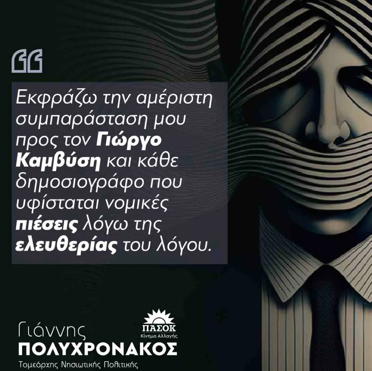 “Εκφράζω την αμέριστη συμπαράσταση μου προς τον Γιώργο Καμβύση και κάθε δημοσιογράφο που υφίσταται νομικές πιέσεις λόγω της ελευθερίας του λόγου.