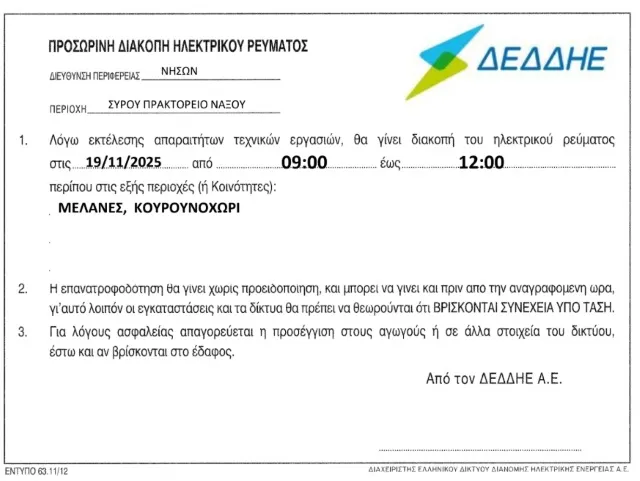Προσωρινή διακοπή στο δίκτυο ηλεκτροδότησης στη Νάξο από τον ΔΕΔΔΗΕ την Τετάρτη 19 Νοεμβρίου σε περιοχές του νησιού λόγω τεχνικών εργασιών.