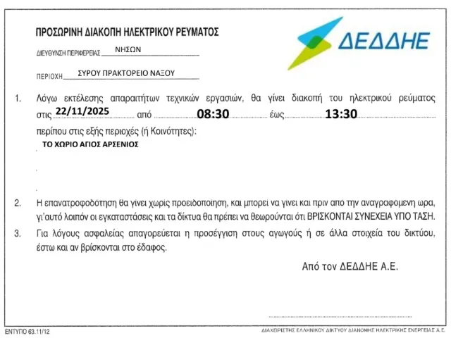 Προσωρινή διακοπή στο δίκτυο ηλεκτροδότησης στη Νάξο από τον ΔΕΔΔΗΕ την το Σάββατο 22 Νοεμβρίου σε περιοχές του νησιού λόγω τεχνικών εργασιών.