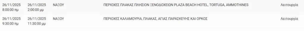 Προσωρινή διακοπή στο δίκτυο ηλεκτροδότησης στη Νάξο από τον ΔΕΔΔΗΕ την Τετάρτη 26 Νοεμβρίου σε περιοχές του νησιού λόγω τεχνικών εργασιών.