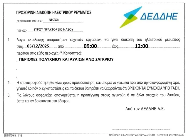 Αναλυτικά, προσωρινή διακοπή ηλεκτρικού ρεύματος θα έχουν οι περιοχές: