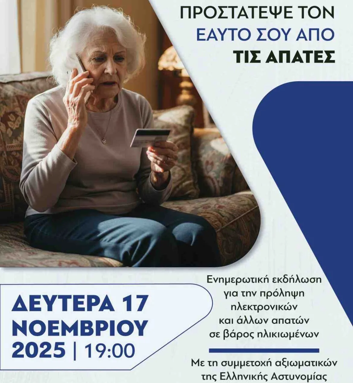 Η εκδήλωση, η οποία πραγματοποιείται σε συνεργασία με το ΚΑΠΗ Νάξου, στοχεύει στην ενημέρωση και ευαισθητοποίηση των πολιτών και ιδιαίτερα των ηλικιωμένων για τις σύγχρονες μορφές ηλεκτρονικής και τηλεφωνικής απάτης, καθώς και για τους τρόπους με τους οποίους μπορούν να προστατευθούν από επιτήδειους που επιχειρούν να τους εξαπατήσουν.