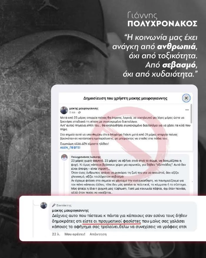 «Θα σας διαβάσω κάτι. Θέλω να το ακούσετε με προσοχή και να μου πείτε την άποψή σας», είπε ο κ. Χρηστίδης και διάβασε το εξής απόσπασμα: «Μετά από 23 ημέρες απεργίας πείνας, θα έπρεπε λογικά να νοσηλευτεί για λίγες μέρες ώστε να ξεκινήσει σταδιακά τη σίτιση με συγκεκριμένο διαιτολόγιο. Αντ’ αυτού, πηγαίνει σπίτι του. Θα ακολουθήσει συγκεκριμένο διαιτολόγιο για να χάσει τα κιλά που πήρε. Στο σημείο αυτό να υπενθυμίσω ότι ο Μαχάτμα Γκάντι, μετά από 21 μέρες απεργίας πείνας βρισκόταν σε κατάσταση ημιπαράλυσης, μην μπορώντας να σταθεί στα πόδια του. Συγγνώμη, αλλά δεν είμαστε ηλίθιοι». Αυτή η ανάρτηση, κατήγγειλε ο κοινοβουλευτικός εκπρόσωπος του ΠΑΣΟΚ, είναι του πρώην προέδρου της Τοπικής Οργάνωσης της Ν.Δ. στη Νάξο και προέδρου της κοινότητας της Νάξου, και ζήτησε να ενημερωθεί ποια είναι τα αντανακλαστικά της Νέας Δημοκρατίας.