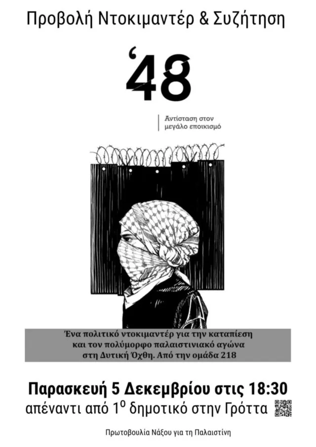 Το ντοκιμαντέρ “48 – Αντίσταση στον Μεγάλο Εποικισμό” είναι ένα πολιτικό ντοκιμαντέρ δημιουργημένο από την ομάδα “218”στο οποίο καταγράφεται ο αγώνας του παλαιστινιακού λαού στη Δυτική Όχθη. Εστιάζει στις μορφές αντίστασης απέναντι στον ισραηλινό εποικισμό και την κατοχή, αναδεικνύοντας την καθημερινή ζωή, τις συλλογικές δράσεις και την αλληλεγγύη των Παλαιστινίων.