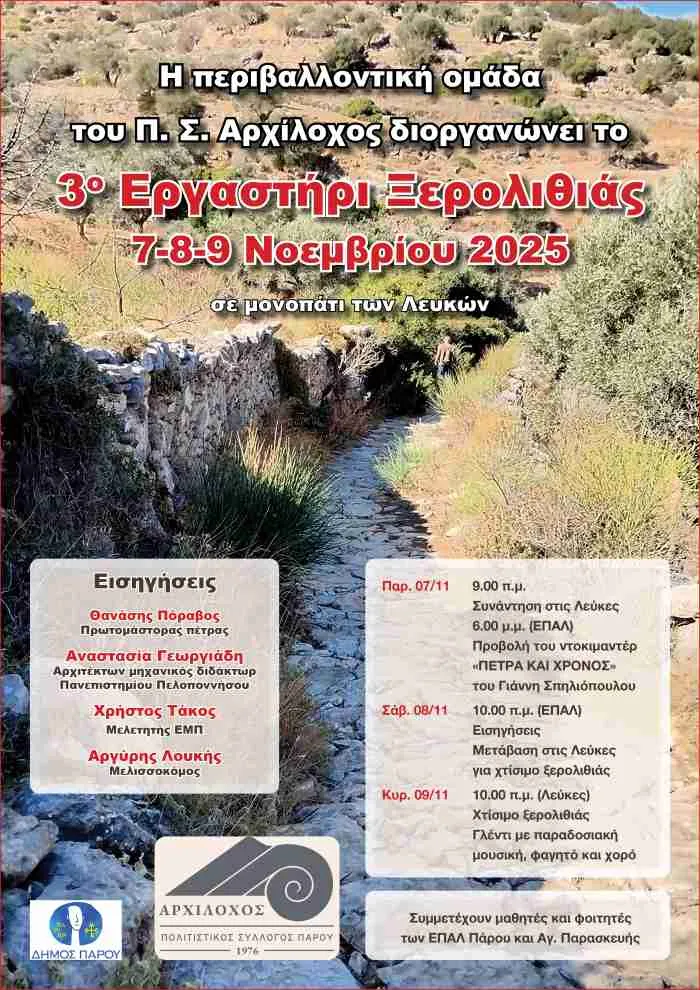 Το κείμενο του πρωτομάστορα Αθανάσιου Πόραβου δεν αποτελεί μονάχα μια περιγραφή. Είναι ένα κάλεσμα, ο καλύτερος πρόλογος για το 3ο Εργαστήρι ξερολιθιάς στην Πάρο που διοργανώνει η Περιβαλλοντική Ομάδα Πολιτιστικού Συλλόγου Αρχίλοχος σε μονοπάτι των Λευκών το τριήμερο 7-9 Νοεμβρίου.