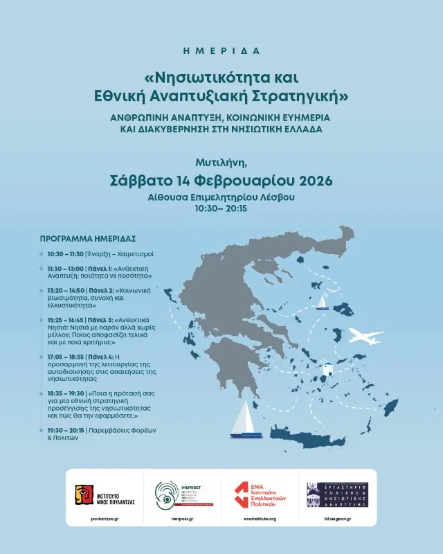Με επίκεντρο την επείγουσα ανάγκη για μία εθνική στρατηγική που αποσκοπεί σε ισόρροπη και δίκαιη ανάπτυξη, κοινωνική ευημερία και ανθεκτικότητα με σύγχρονη και αποτελεσματική διακυβέρνηση σε όλη τη νησιωτική Ελλάδα, η κοινή πρωτοβουλία των τριών Ινστιτούτων, ΕΝΑ, ΙΝΕΡΠΟΣΤ και Ν. ΠΟΥΛΑΝΤΖΑΣ που πραγματοποιείται στη Μυτιλήνη την 14η Φεβρουαρίου 2026, ανοίγει τoν διάλογο με σκοπό την ανάδειξη σύγχρονων πολιτικών για την προστασία και προάσπιση της νησιωτικότητας σε μία χρονική συγκυρία που και η Ευρώπη καλείται να αντιμετωπίσει νέες προκλήσεις ειδικά για τα νησιά της από την Γροιλανδία έως και την Κρήτη.