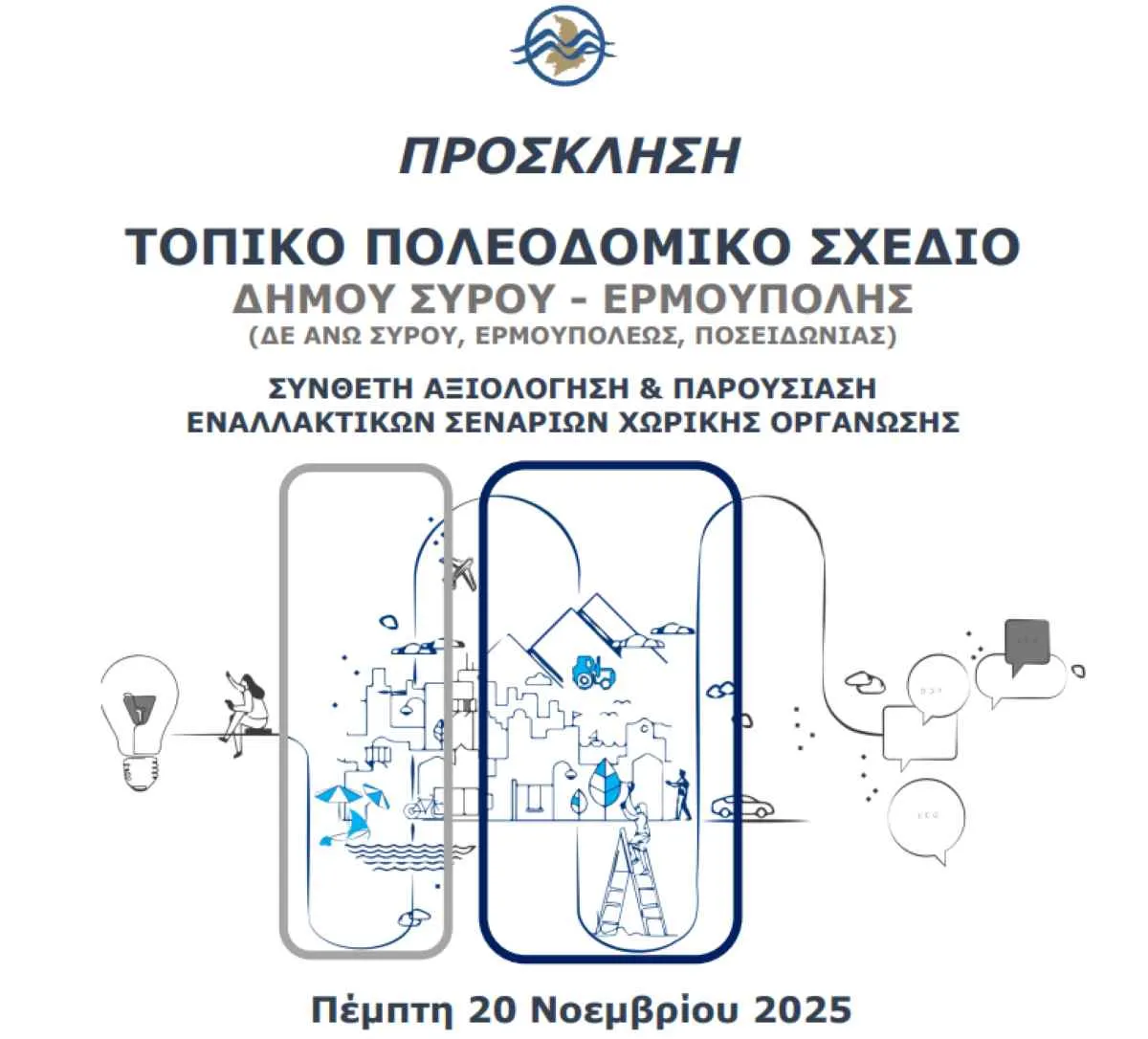 Ο Δήμος Σύρου-Ερμούπολης, στο πλαίσιο της εκπόνησης της μελέτης «Τοπικό Πολεοδομικό Σχέδιο (ΤΠΣ) Δήμου Σύρου–Ερμούπολης (ΔΕ: ΑΝΩ ΣΥΡΟΥ, ΕΡΜΟΥΠΟΛΕΩΣ, ΠΟΣΕΙΔΩΝΙΑΣ)» διοργανώνει ανοιχτή εκδήλωση για την παρουσίαση των εναλλακτικών σεναρίων χωρικής οργάνωσης του Δήμου που συντάχθηκαν από την ανάδοχο της μελέτης ένωση εταιρειών «Ροϊκός Σύμβουλοι Μηχανικοί Α.Ε. – Enveco Ανώνυμη Εταιρεία Προστασίας και Διαχείρισης Περιβάλλοντος AE»